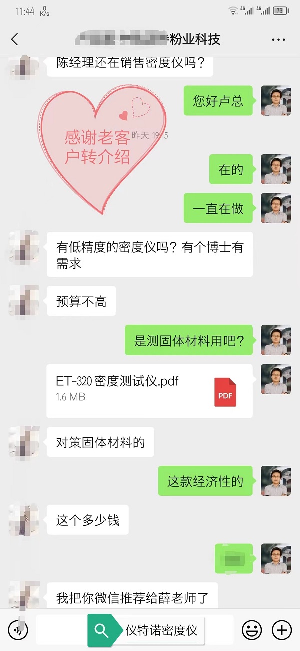 做業(yè)務(wù),有客戶幫忙介紹生意,而且還是多年以后,這真是件幸福的事情,客戶之所以幫你推薦客戶,是因為對你產(chǎn)品質(zhì)量的認(rèn)可。每個人手上的資源都不多,能給介紹客戶資源,這是絕對的真愛,也是對你產(chǎn)品和人品認(rèn)可后的動作。這種來之不易的幸福,能夠激勵我們持續(xù)做好密度儀的品質(zhì)和服務(wù)。