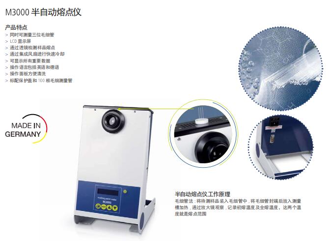 M3000半自動(dòng)熔點(diǎn)儀是采用毛細(xì)管法:將待測(cè)樣品裝入毛細(xì)管中 將毛細(xì)管封端后放入測(cè)量槽加熱 通過放大鏡觀察 記錄初熔溫度及全熔溫度,這兩個(gè)溫度就是熔點(diǎn)范圍。